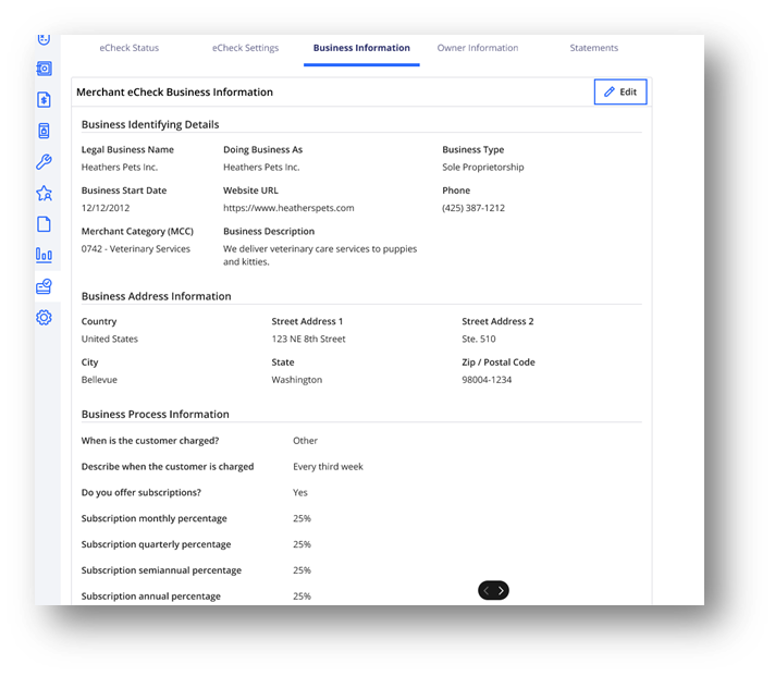 - Follow these steps to view and manage the eCheck settings, business information, and owner information for your MID:
