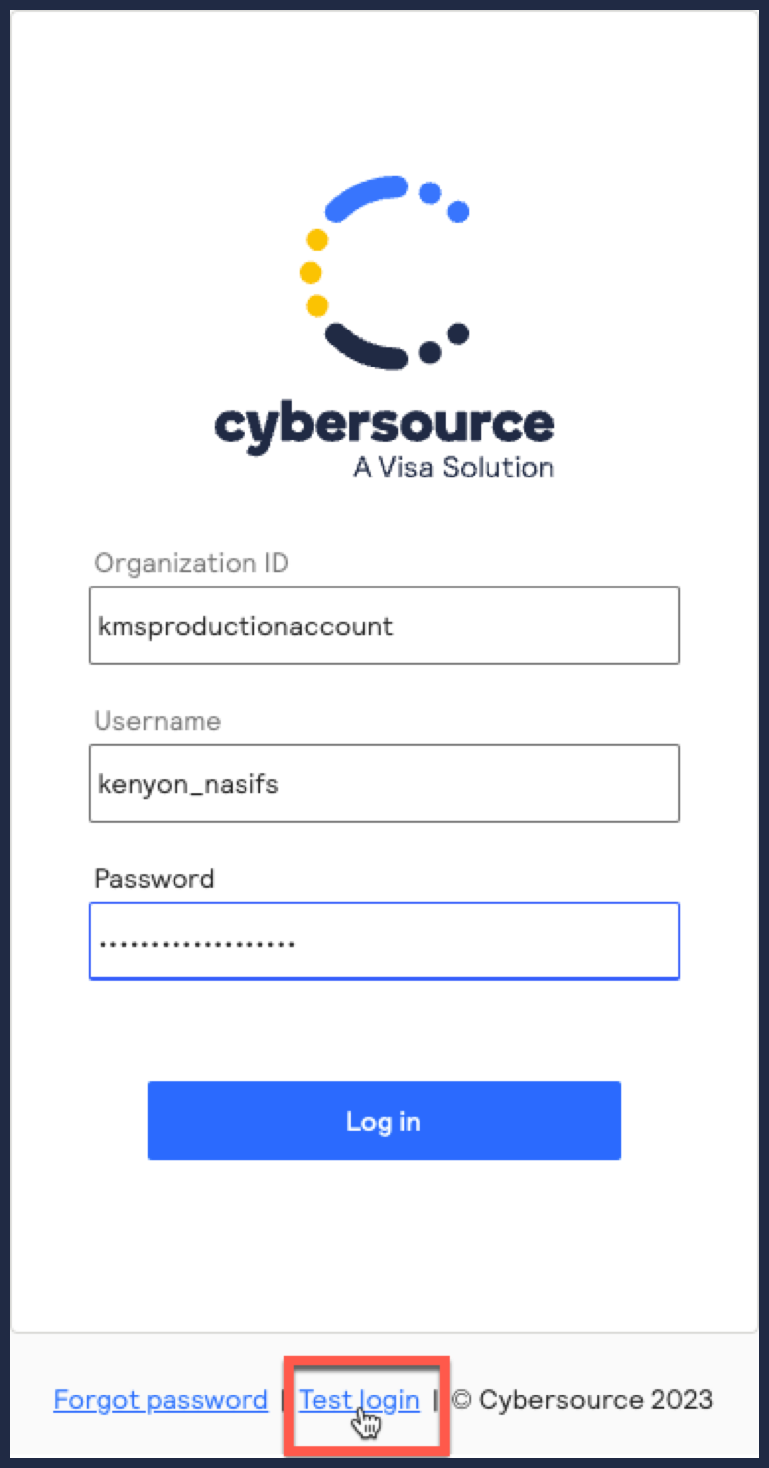 - Enter your credentials and log in to your test environment. The organization ID is your MID.