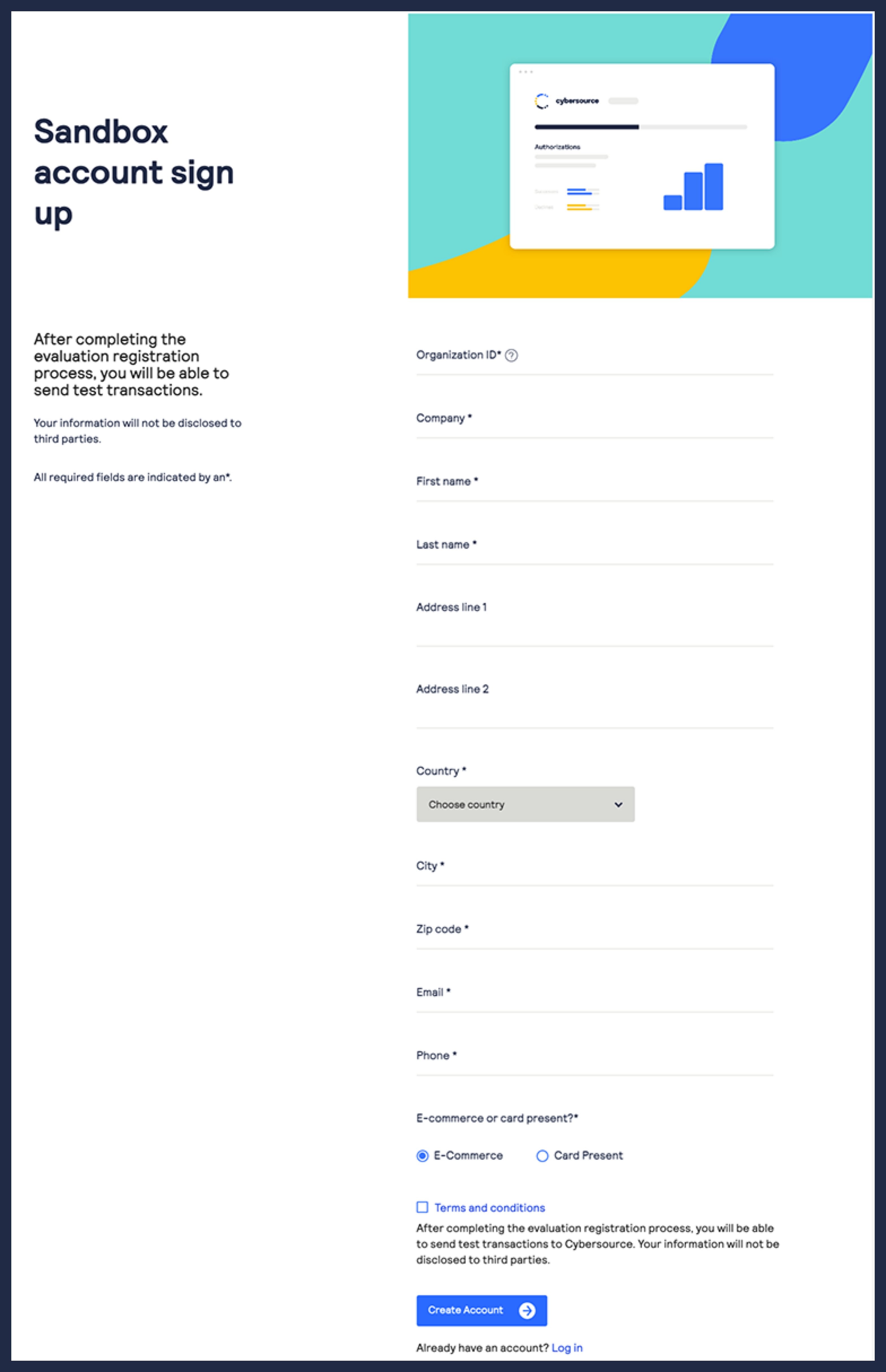 - Go to theCybersourceDeveloper Center sandbox account sign-up page: